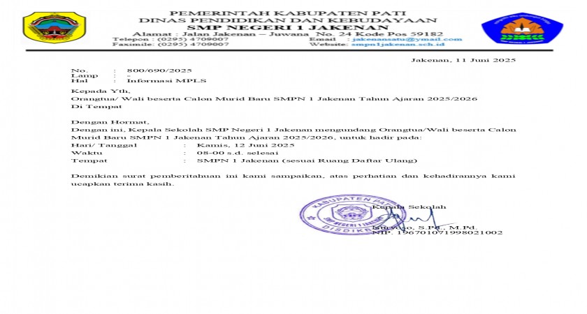 Berikut kami sampaikan Surat Undangan terkait informasi MPLS SMPN 1 Jakenan Tahun Ajaran 2025/2026. Bisa diunduh di link berikut ini Surat Undangan